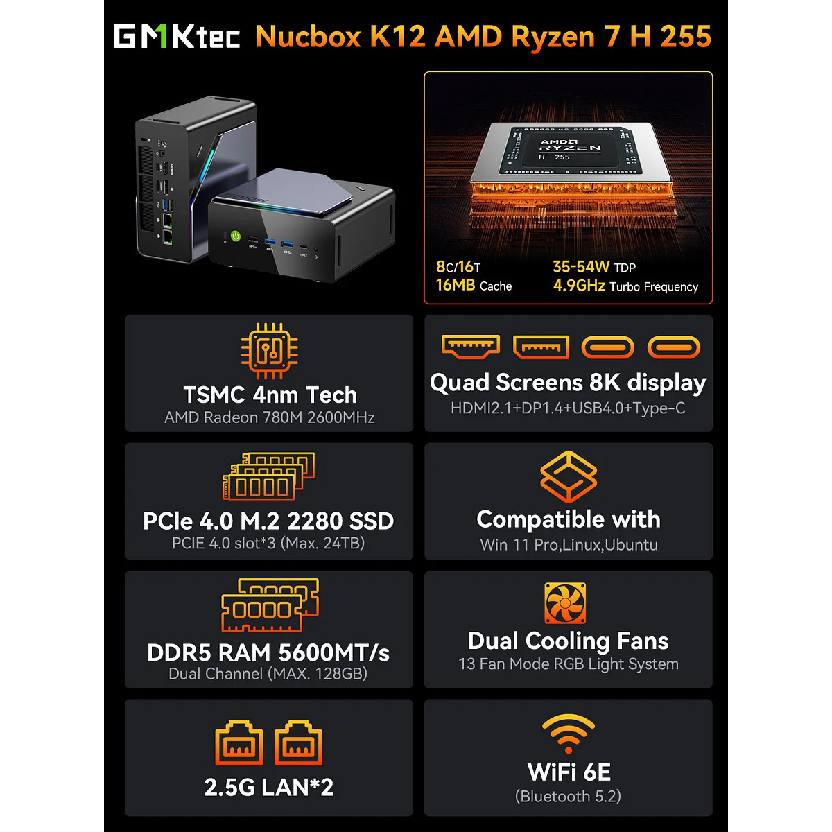 NucBox K12 MiniPC System - Windows11 Pro, AMD Ryzen 7 H255, Radeon Graphics 780Mm Graphics Core Count: 12, Graphics Frequency 2600 MHz, 32GB DDR5 5600Mhz, 1TB M.2 2280 NVMe, Bluetooth 5.2, WiFi 6, 4 displays 1xHDMI 2.1 (8K@60Hz) / 2x Type-C USB4.0 full feature/ 1x DisplayPort 2.1 (8K@60Hz), 2x 2.5G LAN, Grey, 132x125x58mm - OCulink Port, 3 Years Pickup Warranty by Distributor